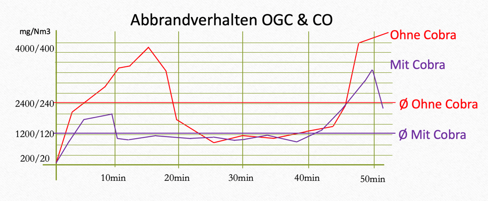 Kaltstart + 1 kompletter Abbrand mit einer Gesamtdauer von 50 Minuten ohne Messunterbrechung